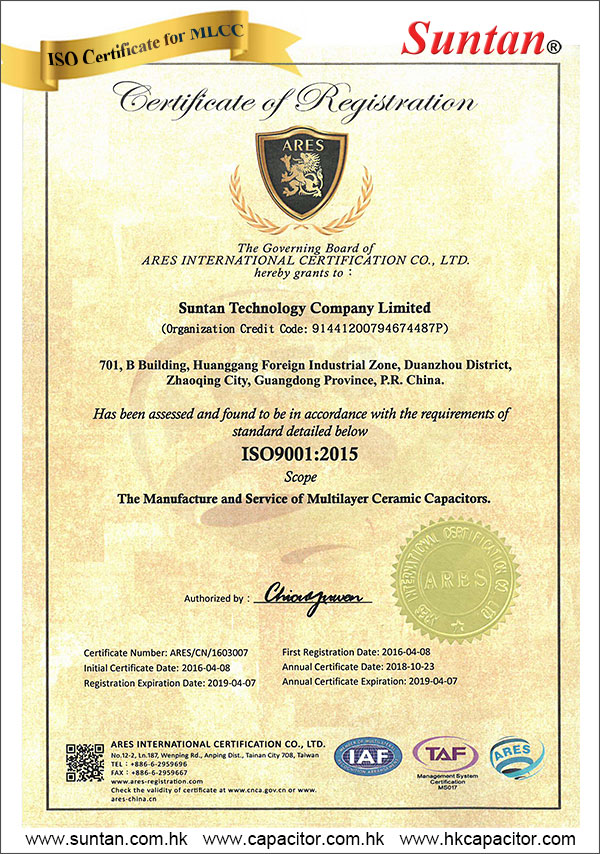 Suntan has updated the ISO certificate covering its multilayer ceramic capacitor (MLCC) product category. This update reflects the continued implementation of documented quality management procedures within MLCC manufacturing processes.